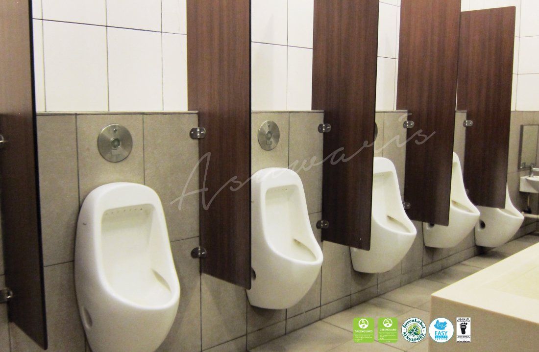 Wall-mounted urinal panel consist of high pressure laminated phenolic board with melamine resin impregnated decorative paper on both sides c/w stainless steel fixing brackets.